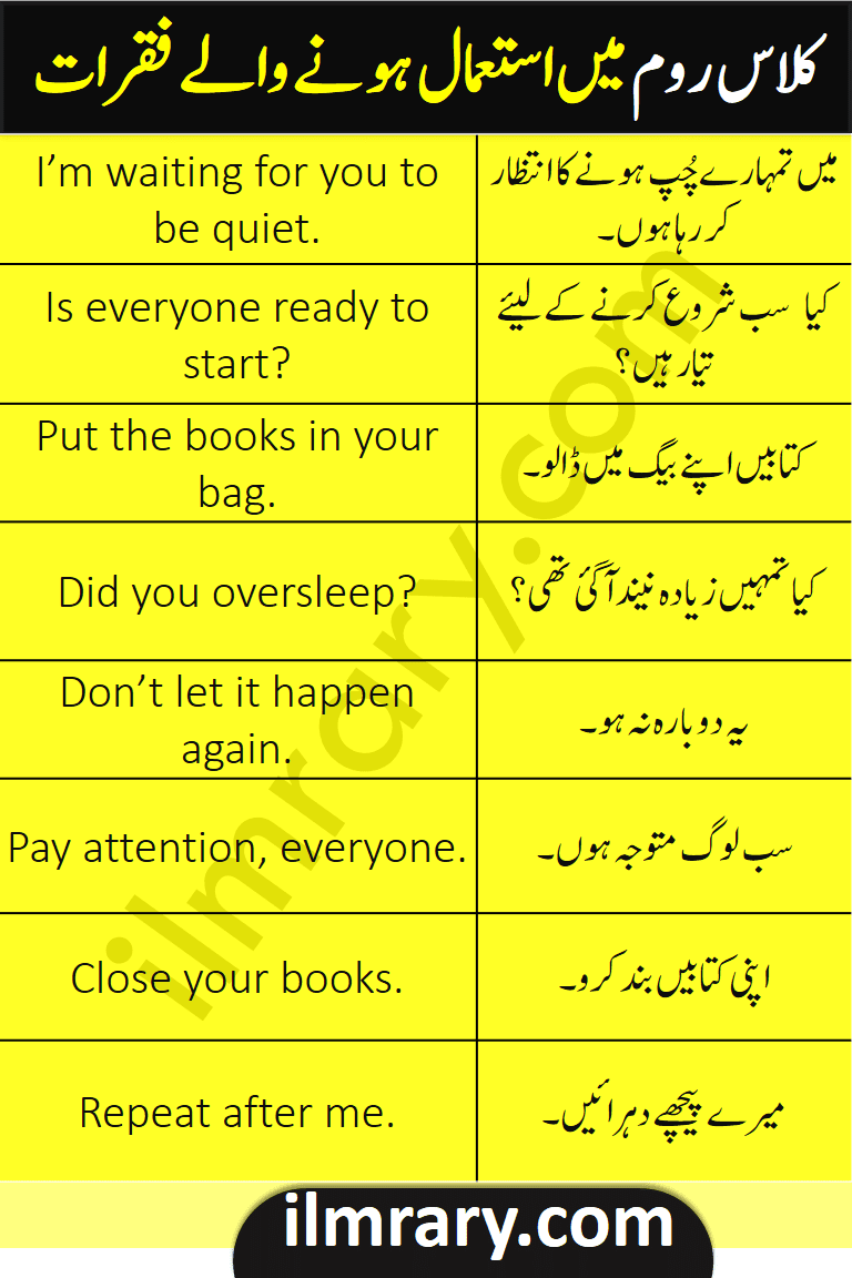 Learn 55 Classroom Sentences in English with Urdu Translation for English Speaking. Daily Use Sentences for Classroom in Urdu will help students Speak English Fluently in the classroom. English to Urdu Sentences for Teachers to help students How to practice the English language in the classroom. not only students but also teachers can keep the classroom environment effective by asking students to use these English sentences in the classroom. English Sentences for Classroom in Urdu will be quite helpful for students to speak English fluently in the classroom.